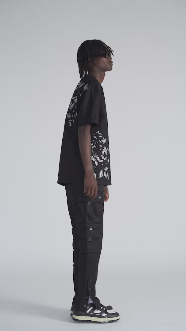 Tailored in our latest offering of 100% organic cotton, this t-shirt in a jet black features a greyscale floral artwork at the side of the front and on the shoulder, complimented by grey tonal 3D embroidered chest branding. The back features the brands signature bar tack at the neck in a matching grey.