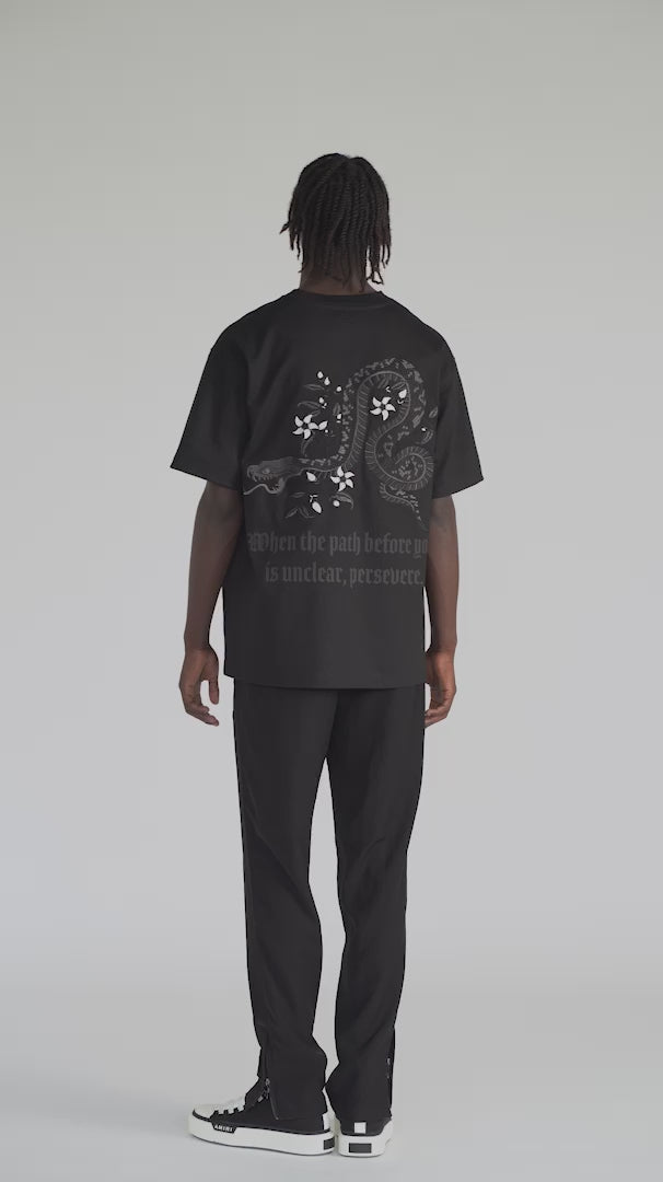 Tailored in our latest offering of 100% organic cotton, this t-shirt in a jet black features an intricate embroidered python artwork with 3D embroidery detailing, over a greyscale floral at the back at the side of the front and on the shoulder, complimented by black 3D embroidered chest branding. The back features the brands signature bar tack at the neck in a matching black and statement below the artwork, "When the path before you is unclear, persevere" in a raised print.