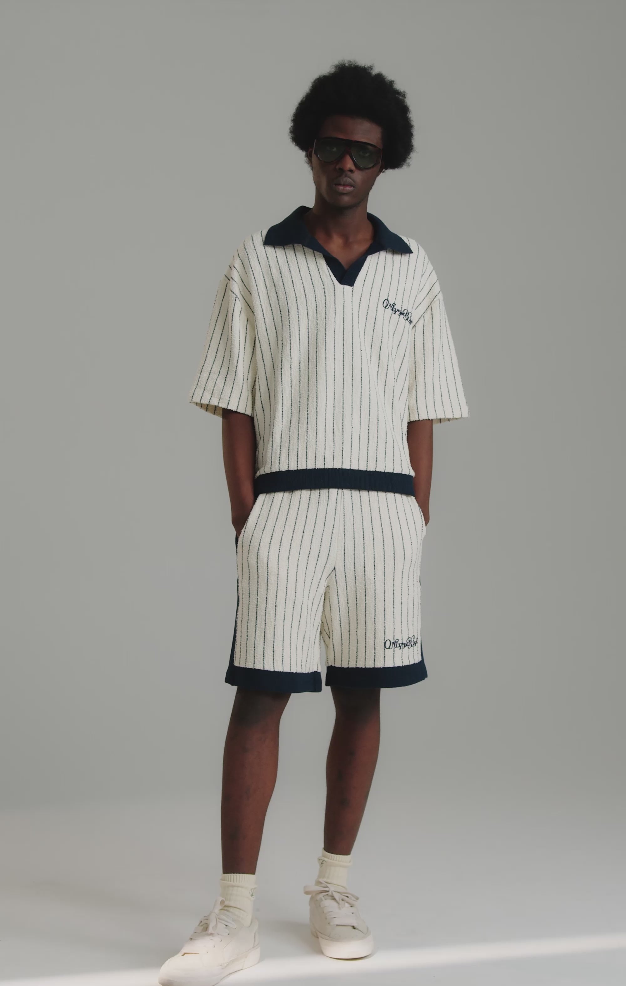 Crafted in a breathable open-knit construction, the fabric features fine vertical striping woven directly into the structure, creating depth and movement without relying on print. The natural base is contrasted by a dark ribbed collar, placket and hem, framing the silhouette with sharp definition.