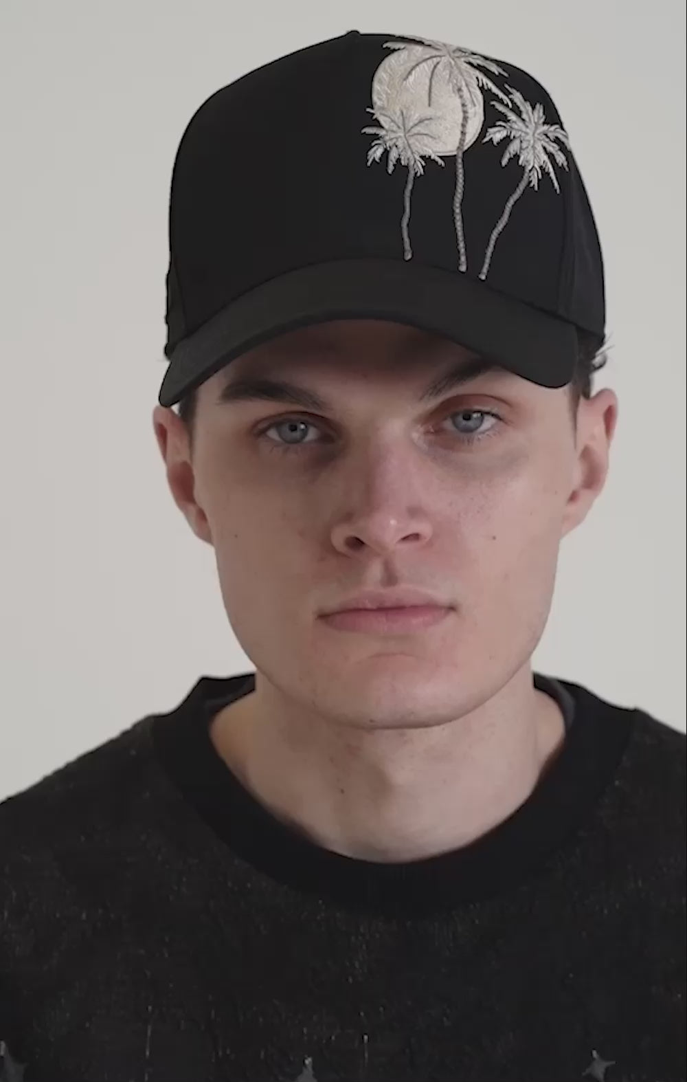 De pet heeft beige borduursels op de voor- en achterkant met palmbomen tegen de achtergrond van een avondlijke zonsondergang. Dit ingewikkelde ontwerp is een eerbetoon aan de serene schoonheid van de woestijn bij nacht, waarbij het contrast van de strakke zwarte stof met het beige borduursel een opvallende visuele aantrekkingskracht creëert.