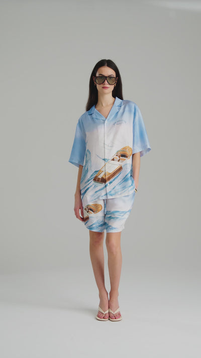 The design features our exclusive hand-painted illustration, originally created by our in-house artist in the London studio before being translated into a full-scale print. A classic wooden speedboat cuts through painted waves, wrapping across the body and continuing onto the reverse, giving the garment a sense of motion from every angle.
